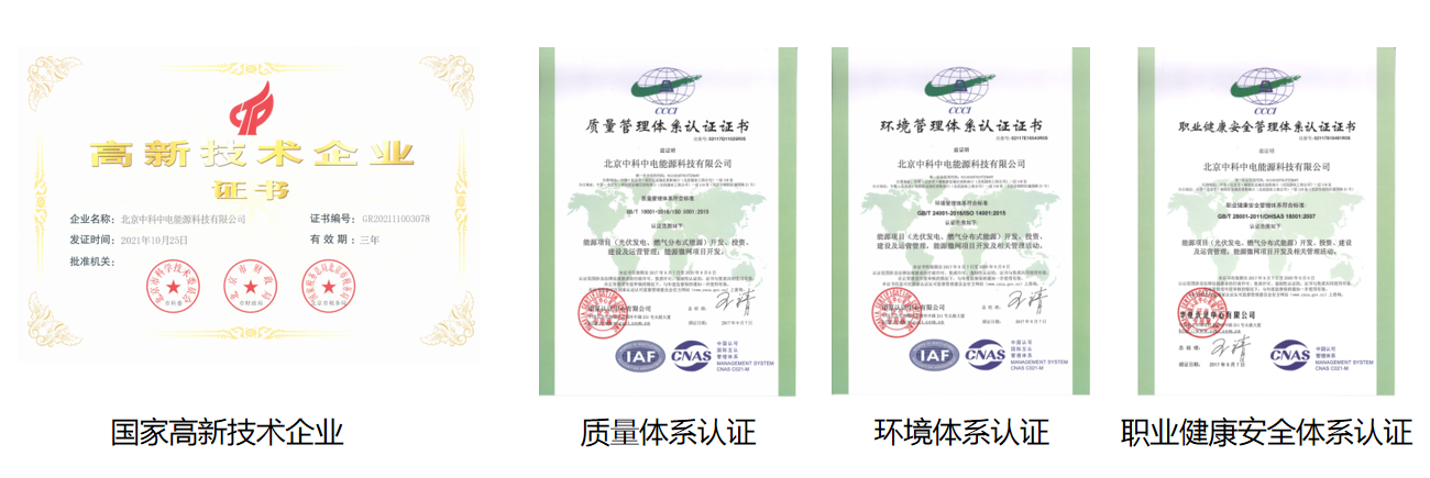 中科中電公司是國家高新技術(shù)企業(yè)、北京市專精特新企業(yè)、北京市創(chuàng)新型企業(yè)。公司通過了質(zhì)量IS0:9001管理體系、ISO14001環(huán)境管理體系、ISO45001職業(yè)健康安全管理體系三大體系認(rèn)證。公司擁有新能源和工業(yè)節(jié)能領(lǐng)域發(fā)明專利1項(xiàng)、實(shí)用新型專利44項(xiàng)、軟件著作權(quán)7項(xiàng),具備建筑機(jī)電安裝工程專業(yè)承包二級(jí)資質(zhì)。